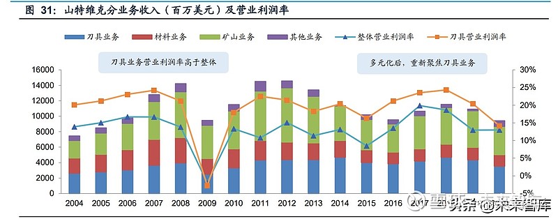 刀具业务围绕产品及服务展开,山特维克两翼并进铸就龙头地位。刀具直接作用于 切削工件,其性能与加工质量、效率有直接关系,对产品性能要求较高;同时刀具 又与工艺紧密联系,需根据工件材质、切削参数等进行选择,种类繁多,服务也非 常重要。产品与服务是海外刀具巨头发展的两条主线。以山特维克为例,其产品革 新围绕材质、结构与涂层,先后推出了机械加紧可转位刀片、伽马涂层、模块化工 具系统、金刚石涂层、氧化铝单晶涂层等新产品;其服务早期围绕销售渠道展开, 逐步建立了完善的培训、配送及售后体系,后续重点推进数字化与定制化服务,通 过刀具选择程序、加工模拟程序等提升了非标定制的效率与经济性。