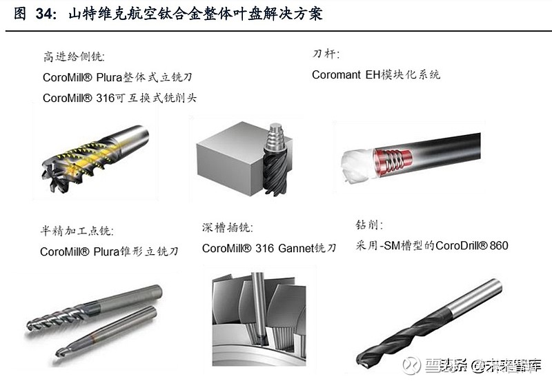 整体解决方案的提供依托于全面产品线。单一零部件的加工需经若干工序,需要不 同的机床刀具,山特维克全面的产品线支撑了其整体解决方案。以航空钛合金整体 叶盘为例,山特维克可为高进给侧铣、半精加工点铣、深槽插铣、钻削提供适用刀 具,并配套了适合小尺寸深入加工的刀杆系统。