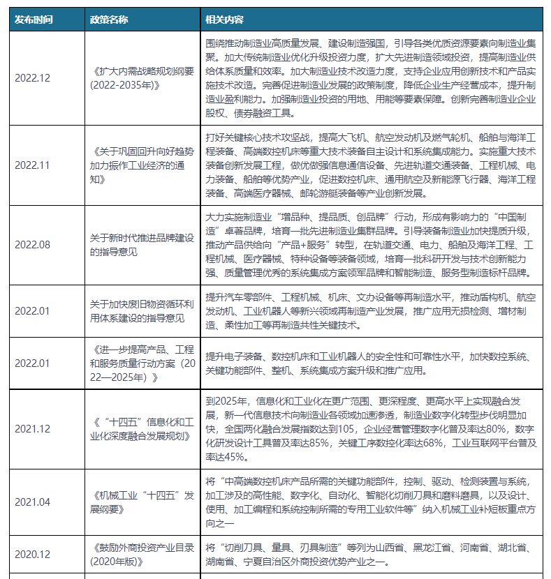 根据观研报告网发布的《中国切削刀具制造行业发展趋势研究与未来投资调研报告(2023-2029年) 》显示,近些年来,为了促进及规范刀具制造行业发展,我国陆续发布了许多政策,如《进一步提高产品、工程和服务质量行动方案(2022—2025年)》中提出提升电子装备、数控机床和工业机器人的安全性和可靠性水平,加快数控系统、关键功能部件、整机、系统集成方案升级和推广应用。