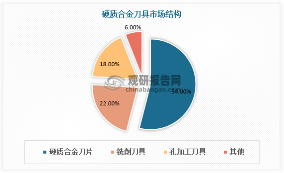 硬质合金刀具主要包括有硬质合金刀片、铣削刀具、车削刀具、孔加工刀具等,其中硬质合金刀片的销售份额占54%,铣削刀具占比22%,孔加工刀具占18%,三者合计占94%,是主要的硬质合金刀具产品。