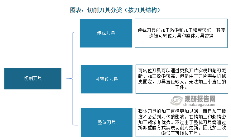 根据刀具结构的不同,切削刀具可以分为可转位刀具、整体刀具和传统刀具(焊接刀具等)。传统刀具的加工效率和加工精度较低,正逐渐被可转位刀具和整体刀具替代,可转位刀具与整体刀具已经成为主流切削刀具产品。