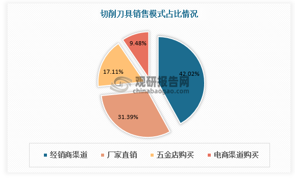 从销售模式上看,国内切削刀具销售主要以经销为主,经销商渠道购买占比42.02%。其次是厂家直销,占比31.39%。五金店购买及电商渠道购买分别占比17.11%、9.48%。