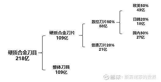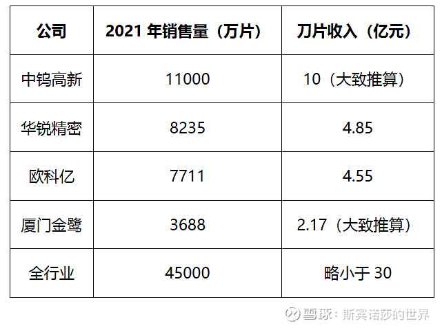 我们以2021年的数据进行推算:根据钨业协会的数据,2021年国内刀片产量超过4.5亿片,而我们看龙头厂商的披露情况,四大龙头厂商合计大概3.06亿片,占比大概68%。然后我们通过收入推算。国内厂商在硬质合金刀片的市场份额略小于30亿元,假设27亿元。然后结合民生证券的测算,预计欧美占比50%,日韩占比20%(当然也有可能欧美40%,日韩30%。数据虽有出入,并不影响总体结论)。